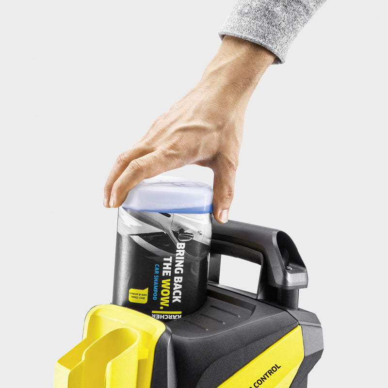 Le K 4 Power Control se distingue aussi par le système de détergent Plug ’n’ Clean de Kärcher, qui permet un remplacement rapide du détergent, une poignée télescopique pour un transport facile et un mode de stationnement pour garder les accessoires à portée de main.