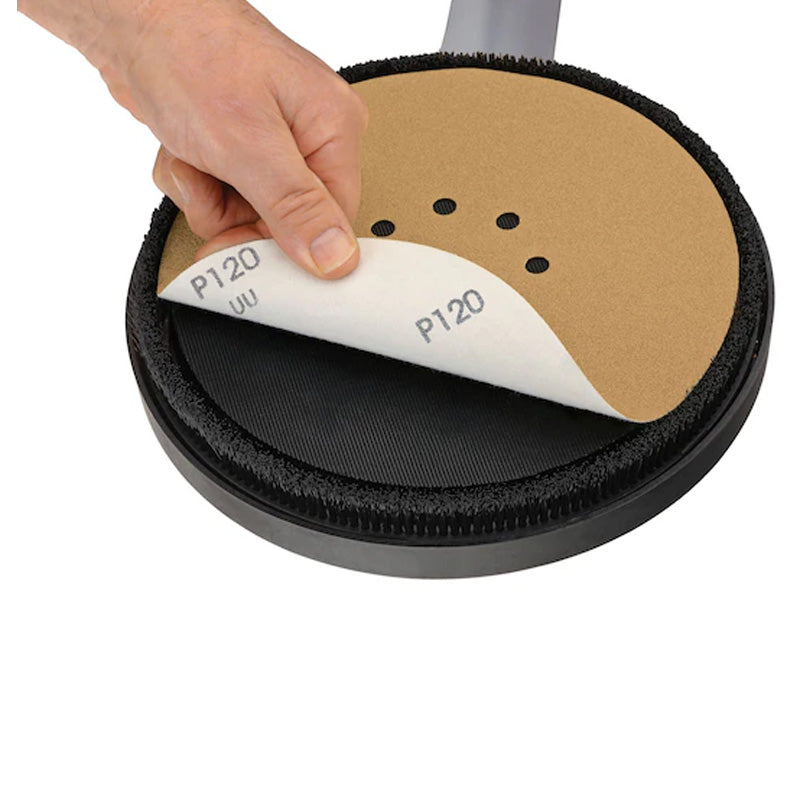Le patin de ponçage de 22,86 cm se connecte rapidement au papier abrasif et à la maille et la tête articulée permet d’atteindre plus facilement les espaces de travail