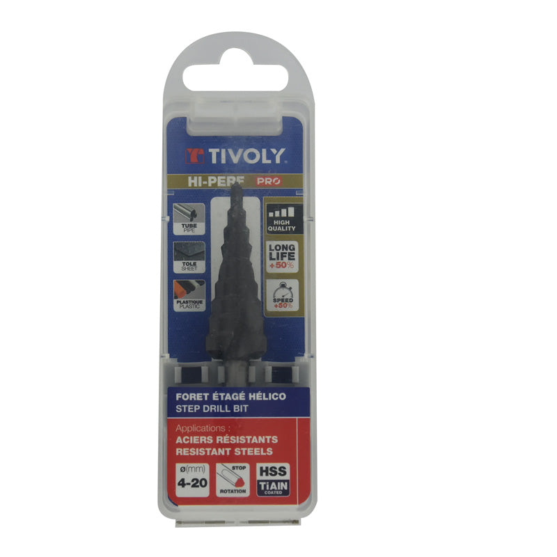 Tivoly Foret conique étagé HSS -Revêtu TiAlN -TivolyNorm -Hélicoïdal -Pointe en croix -Queue à 3 méplats (Boite brochable) / ØMin/Max : 4/20